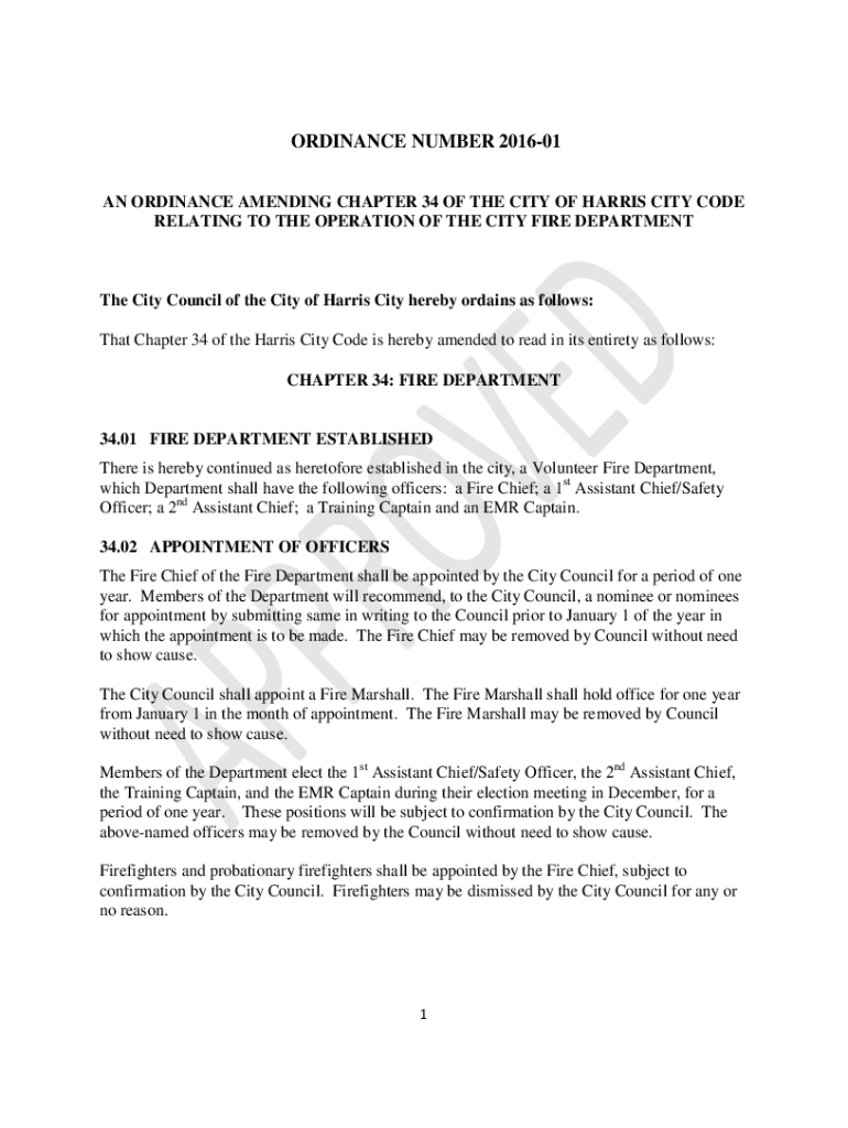 ORDINANCE NUMBER 201601 AN ORDINANCE AMENDING CHAPTER 34 OF THE CITY OF HARRIS CITY CODE RELATING TO THE OPERATION OF THE CITY FIRE Department City Council of the City of Harris City hereby ordains