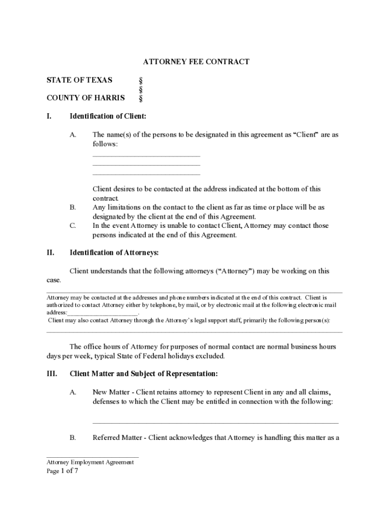 ATTORNEY FEE CONTRACT STATE OF TEXAS COUNTY OF HARRIS I. Identification of Client: A.B. C. II. The name(s) of the persons to be designated in this agreement as Client are as follows: ___ ___ ___ Client