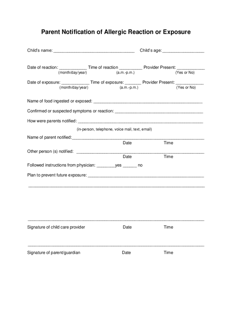 Parent Notification of Allergic Reaction or Exposure Child's name: ___Child sage: ___Date of reaction: ___ Time of reaction ___ Provider Present: ___ (month/day/year)(a.m.p.m.)(Yes or No)Date of exposure: