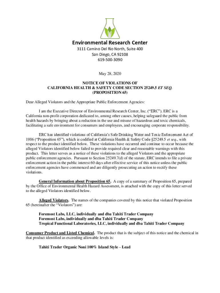 Environmental Research Center 3111 Camino Del Rio North, Suite 400 San Diego, CA 92108 6195003090 May 28, 2020, NOTICE OF VIOLATIONS OF CALIFORNIA HEALTH & SAFETY CODE SECTION 25249.5 ET SEQ. (PROPOSITION