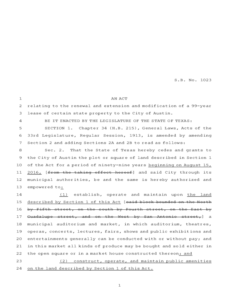 S.B.ANO. A10231AN ACT2relating to the renewal and extension and modification of a 99year3lease of certain state property to the City of Austin.4BE IT ENACTED BY THE LEGISLATURE OF THE STATE OF TEXAS:5SECTIONA1.