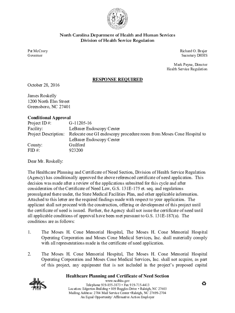 North Carolina Department of Health and Human Services Division of Health Service Regulation Pat McCrory Governor Richard O. Braver Secretary HHS Mark Payne, Director Health Service RegulationRESPONSE