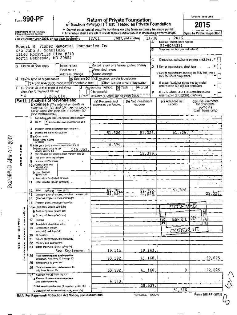 FrFormOMB No. 15450052990PFReturn of Private Foundation or Section 4947(a)(1) Trust Treated as Private Foundation2015^ On not enter social security numbers on this form as it may be made public. ^