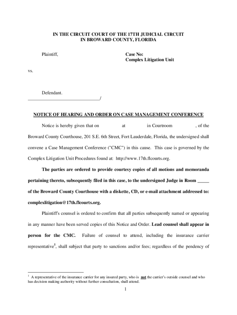 IN THE CIRCUIT COURT OF THE 17TH JUDICIAL CIRCUIT IN BROWARD COUNTY, FLORIDA Plaintiff, Case No: Complex Litigation Units. Defendant. ___/NOTICE OF HEARING AND ORDER ON CASE MANAGEMENT CONFERENCE
