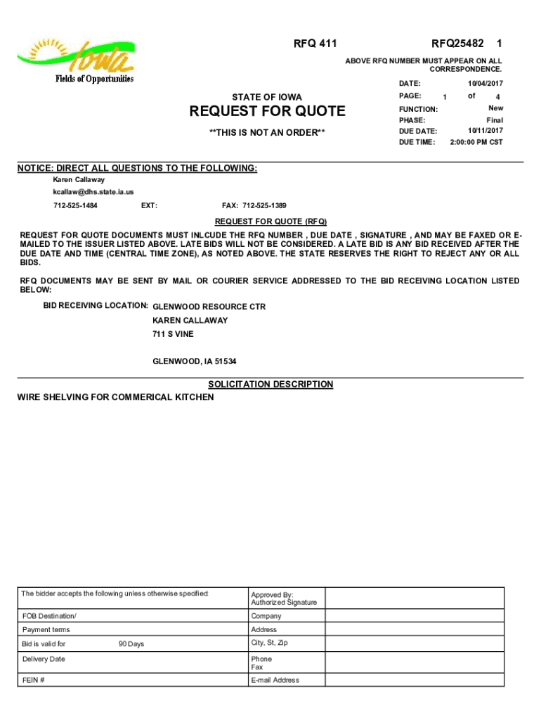 RFQ 411RFQ254821ABOVE RFQ NUMBER MUST APPEAR ON ALL CORRESPONDENCE. DATE:STATE OF IOWAREQUEST FOR QUOTE **THIS IS NOT AN ORDER**PAGE:10/04/20171of4FUNCTION:Phase: DUE DATE: DUE TIME:Final 10/11/2017