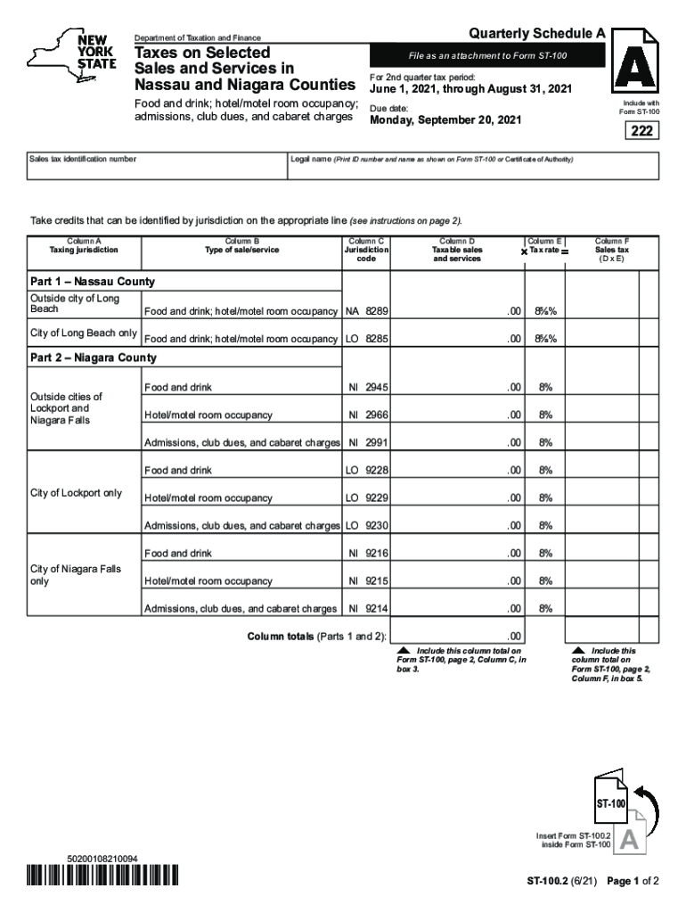 Quarterly Schedule Department of Taxation and FinanceTaxes on Selected Sales and Services in Nassau and Niagara CountiesFile as an attachment to Form ST100 For 2nd quarter tax period:June 1, 2021,