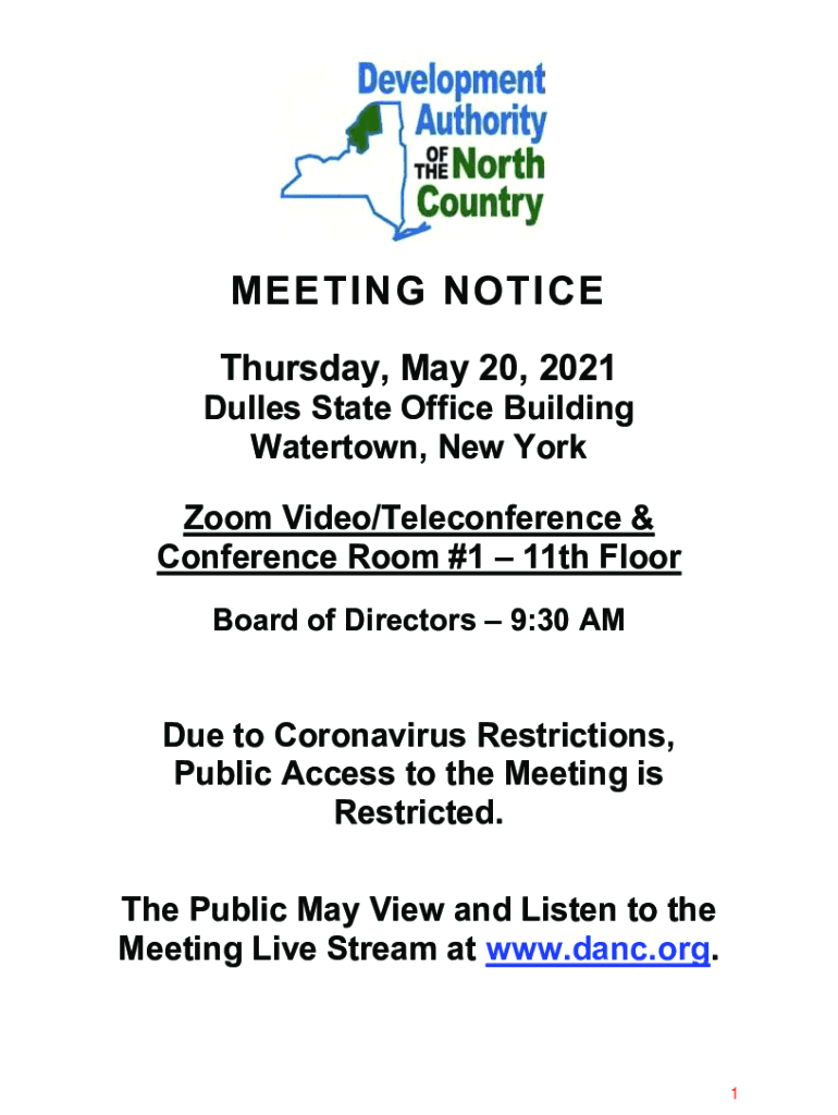 MEETING NOTICE Thursday, May 20, 2021Dulles State Office Building Watertown, New York Zoom Video/Teleconference & Conference Room #1 11th Floor Board of Directors 9:30 Due to Coronavirus Restrictions,