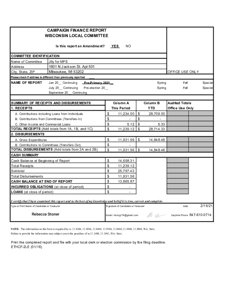CAMPAIGN FINANCE REPORT WISCONSIN LOCAL COMMITTEE Is this report an Amendment?YESNOCOMMITTEE IDENTIFICATION Name of CommitteeJilly for Misaddress City, State, ZIP1601 N Jackson St. Apt 501 Milwaukee,