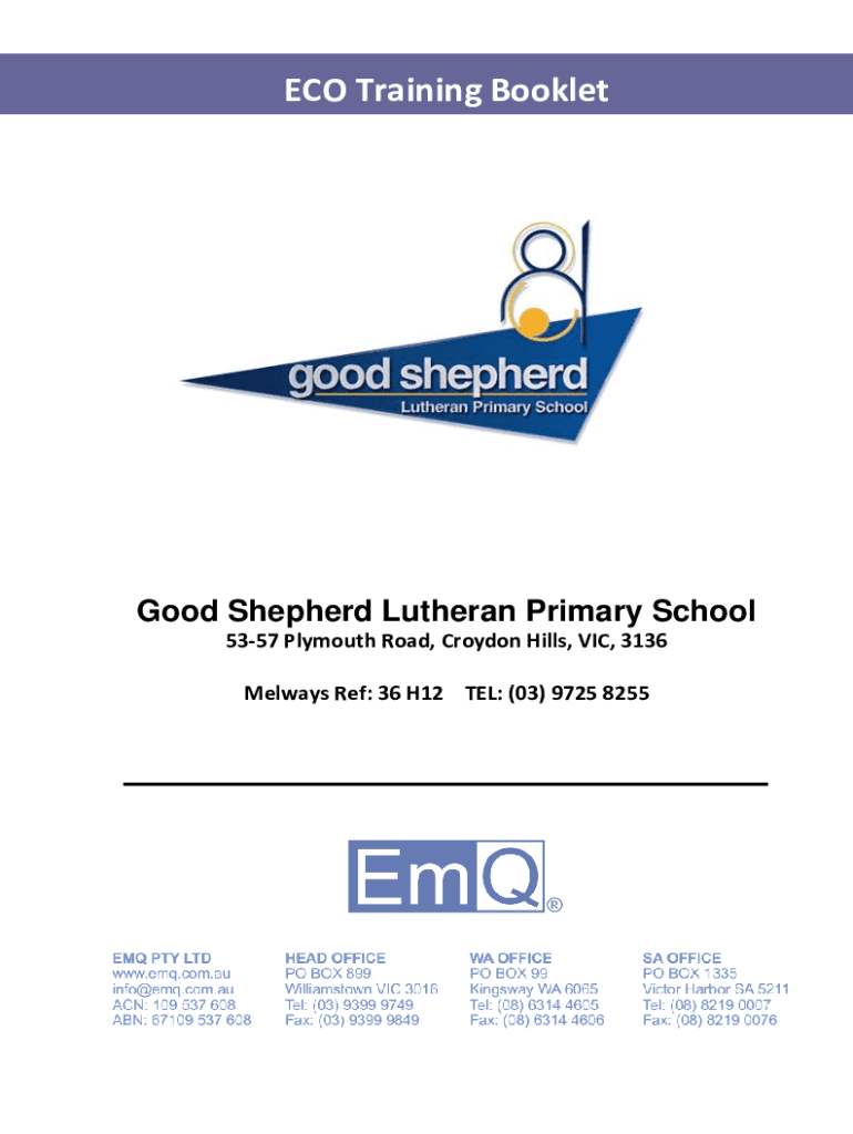 ECO Training Booklet Good Shepherd Lutheran Primary School 5357 Plymouth Road, Croydon Hills, VIC, 3136 Mel ways Ref: 36 H12 TEL: (03) 9725 8255Table of ContentsIntroduction .................................................................................................................