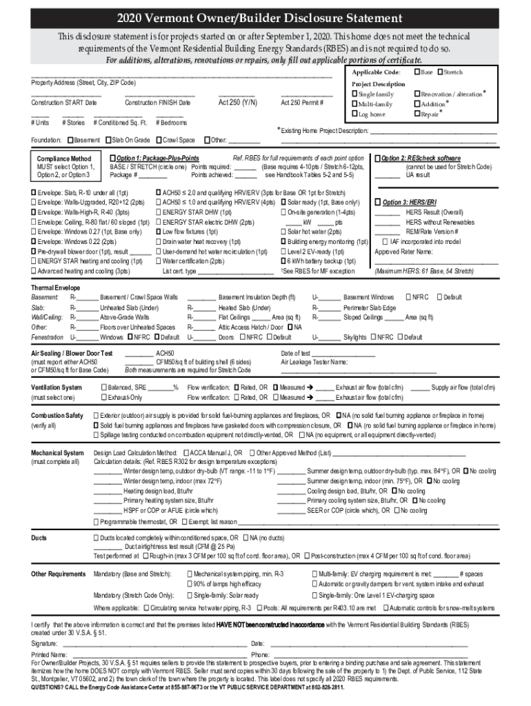 2020 Vermont Owner/Builder Disclosure Statement This disclosure statement is for projects started on or after September 1, 2020. This home does not meet the technical requirements of the Vermont Residential