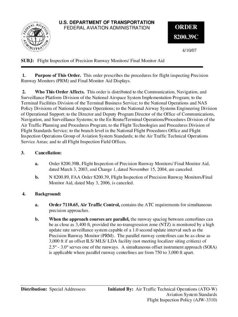 U.S. DEPARTMENT OF TRANSPORTATION FEDERAL AVIATION ADMINISTRATIONORDER 8200.39C 4/10/07SUBJ: Flight Inspection of Precision Runway Monitors/ Final Monitor Aid 1. Purpose of This Order. This order