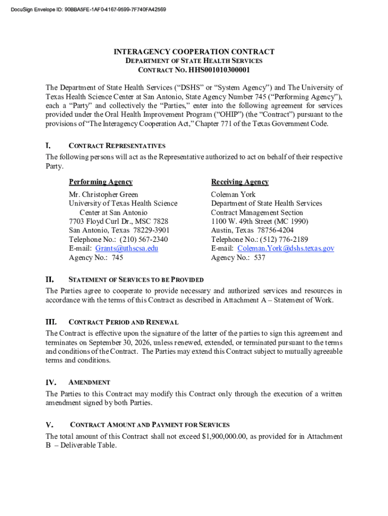 INTERAGENCY COOPERATION CONTRACT DEPARTMENT OF STATE HEALTH SERVICES CONTRACT NO. HHS001010300001 The Department of State Health Services (DSS or System Agency) and The University of Texas Health