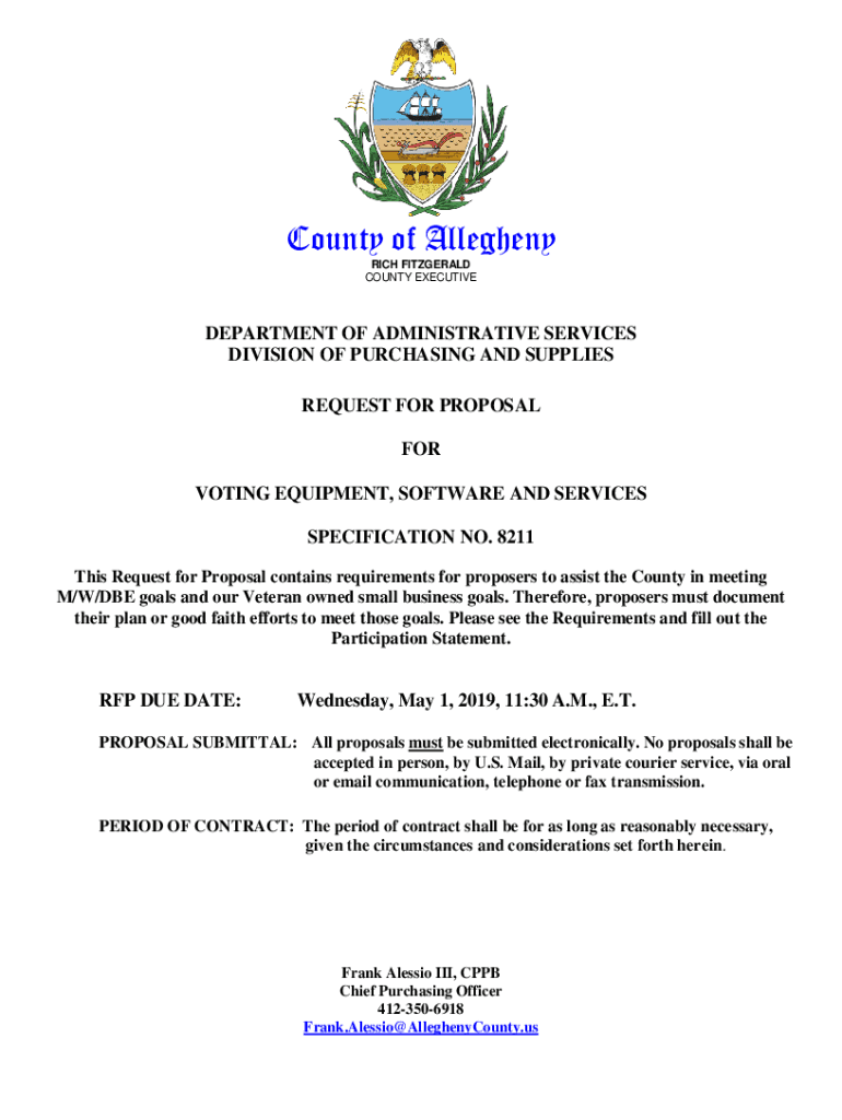 County of Allegheny RICH FITZGERALD COUNTY EXECUTIVEDEPARTMENT OF ADMINISTRATIVE SERVICES DIVISION OF PURCHASING AND SUPPLIES REQUEST FOR PROPOSAL FOR VOTING EQUIPMENT, SOFTWARE AND SERVICES SPECIFICATION