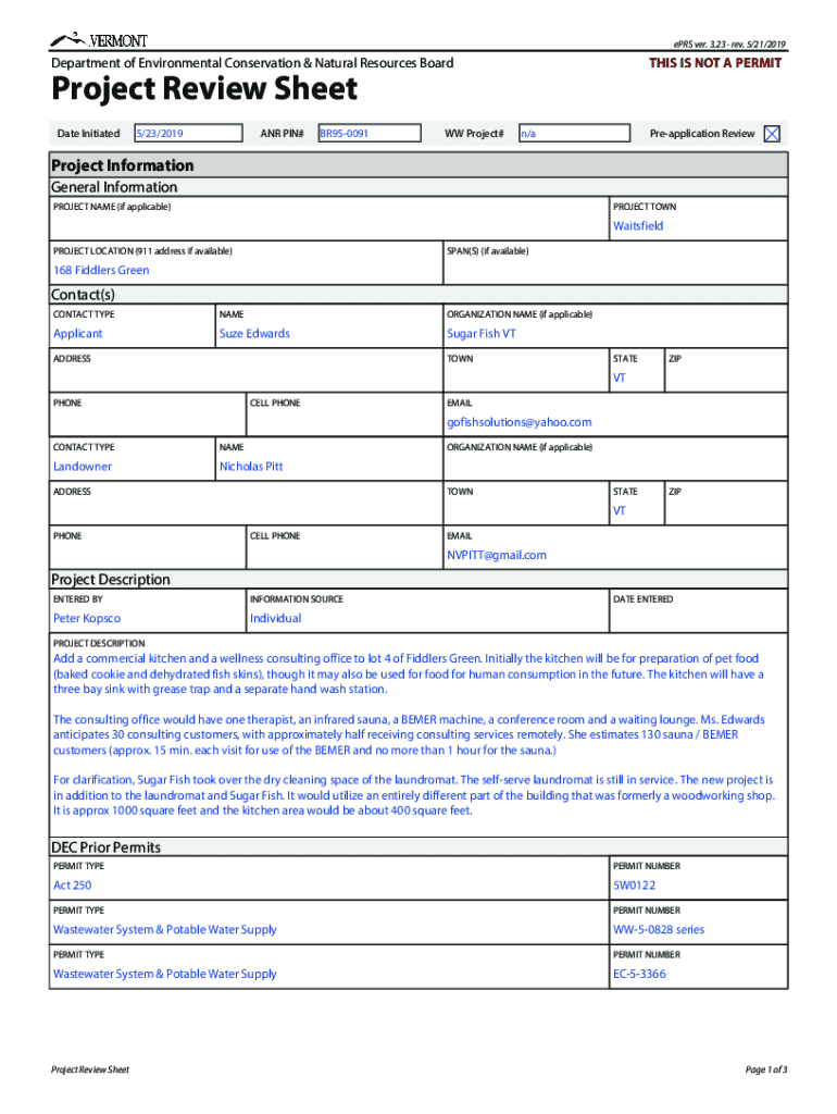EARS very. 3.23 rev. 5/21/2019Department of Environmental Conservation & Natural Resources Boards IS NOT A PERMITProject Review Sheet Date Initiated5/23/2019ANR PIN×BR950091WW Project×Reapplication