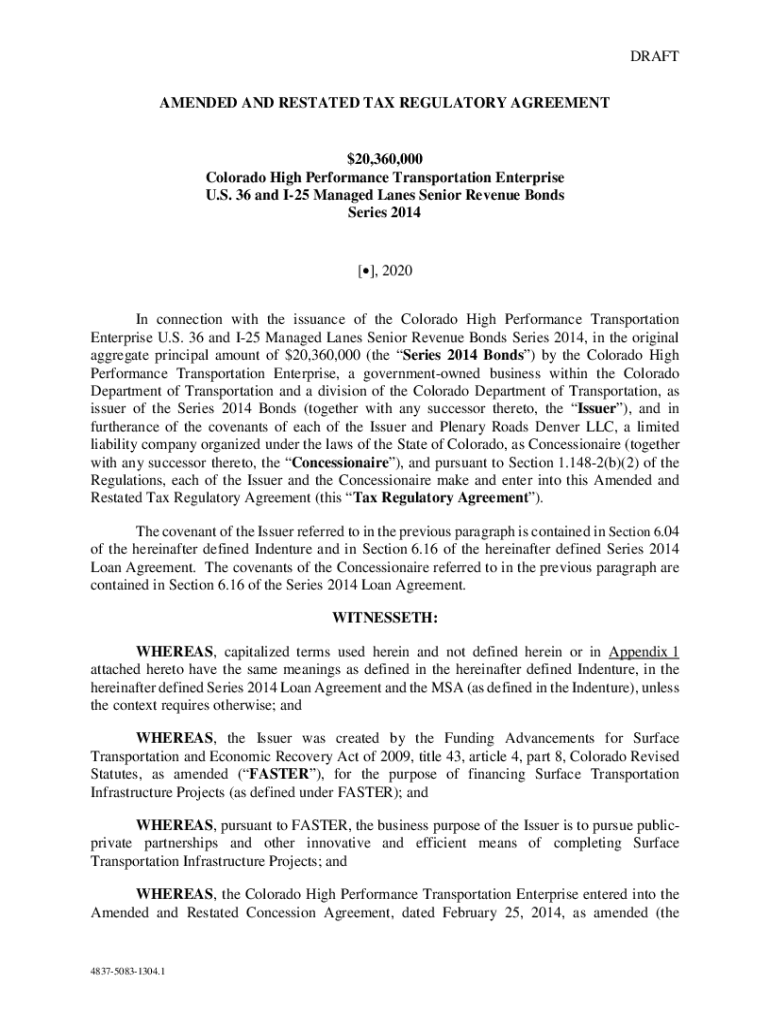 DRAFT AMENDED AND RESTATED TAX REGULATORY AGREEMENT×20,360,000 Colorado High Performance Transportation Enterprise U.S. 36 and I25 Managed Lanes Senior Revenue Bonds Series 2014[], 2020 In connection