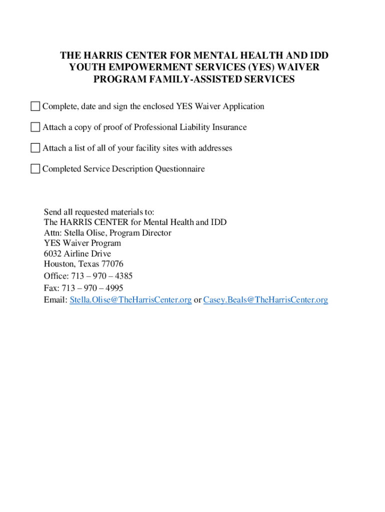 THE HARRIS CENTER FOR MENTAL HEALTH AND ADD YOUTH EMPOWERMENT SERVICES (YES) WAIVER PROGRAM FAMILYASSISTED SERVICES Complete, date and sign the enclosed YES Waiver Application Attach a copy of proof