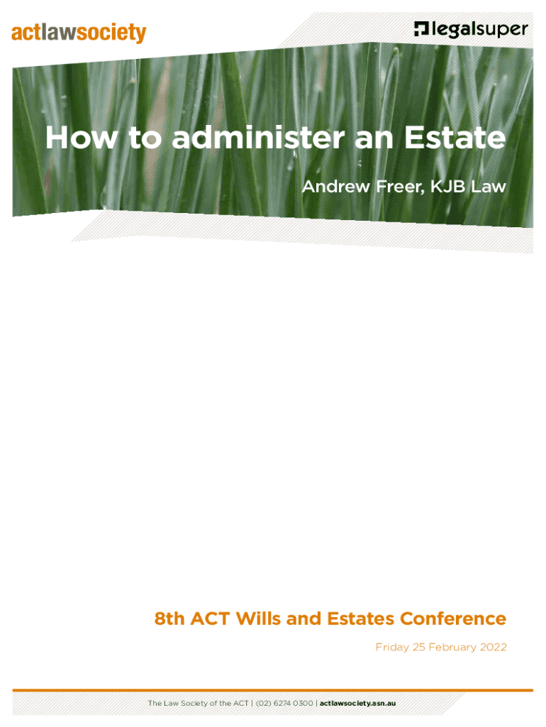 How to administer an Estate Andrew Freer, KGB Law8th ACT Wills and Estates Conference Friday 25 February 2022The Law Society of the ACT | (02) 6274 0300 | actlawsociety.ASN.show to Administer an Estate