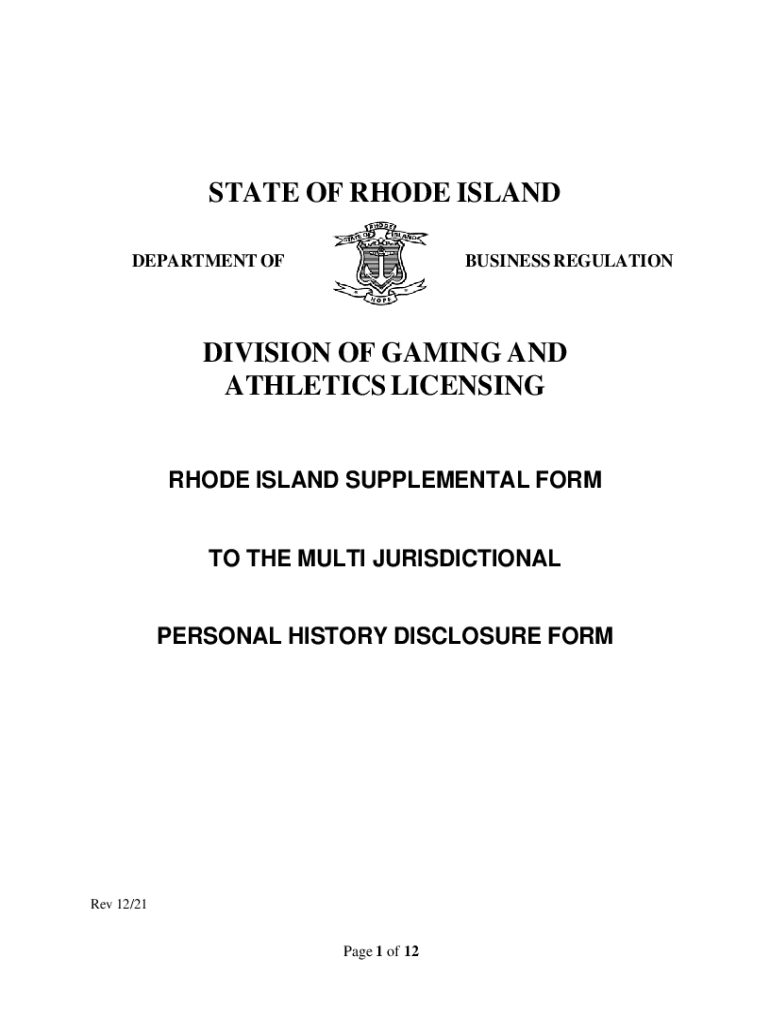 STATE OF RHODE ISLAND DEPARTMENT BUSINESS REGULATIONDIVISION OF GAMING AND ATHLETICS LICENSING RHODE ISLAND SUPPLEMENTAL FORM TO THE MULTI JURISDICTIONAL PERSONAL HISTORY DISCLOSURE FORM Rev 12/21Page