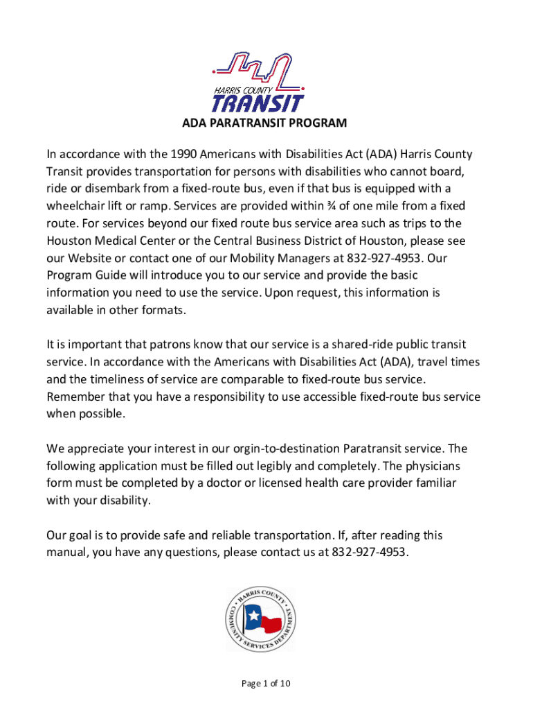 ADA PRE-TRANSIT PROGRAM In accordance with the 1990 Americans with Disabilities Act (ADA) Harris County Transit provides transportation for persons with disabilities who cannot board, ride or disembark