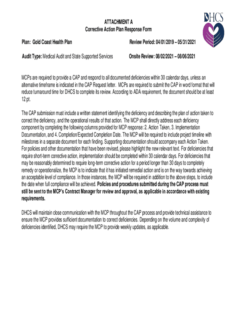 ATTACHMENT A Corrective Action Plan Response Form Plan: Gold Coast Health Preview Period: 04/01/2019 05/31/2021Audit Type: Medical Audit and State Supported ServicesOnsite Review: 08/02/2021 08/06/2021MCPs
