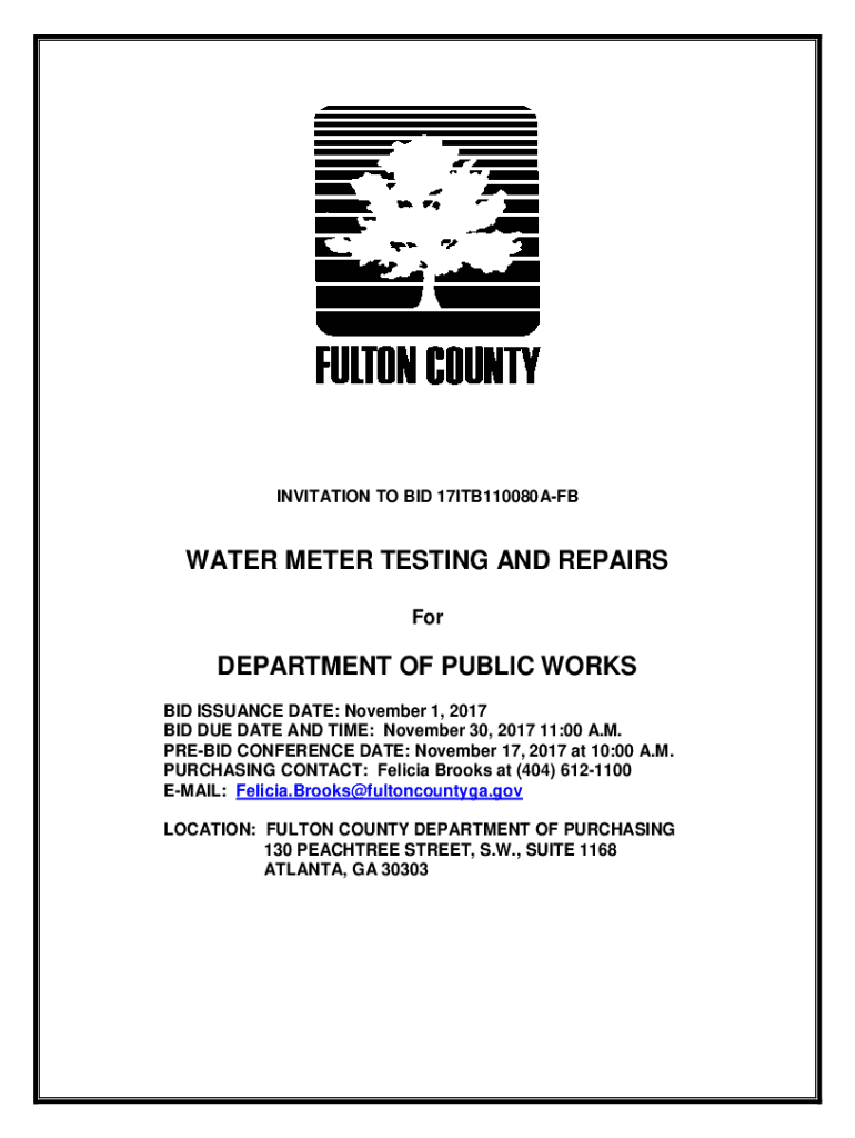 INVITATION TO BID 17ITB110080AFBWATER METER TESTING AND REPAIRS Department OF PUBLIC WORKS BID ISSUANCE DATE: November 1, 2017, BID DUE DATE AND TIME: November 30, 2017 11:00 A.M. PREBID CONFERENCE