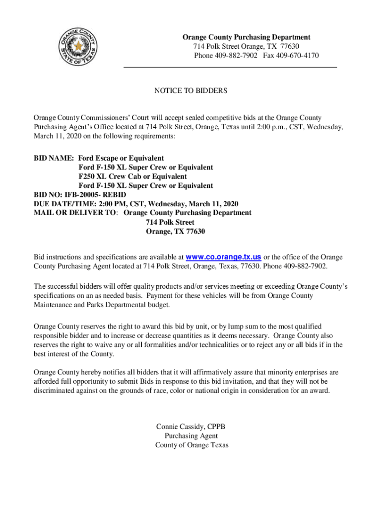 Orange County Purchasing Department 714 Polk Street Orange, TX 77630 Phone 4098827902 Fax 4096704170 ___NOTICE TO BIDDERS Orange County Commissioners Court will accept sealed competitive bids at the