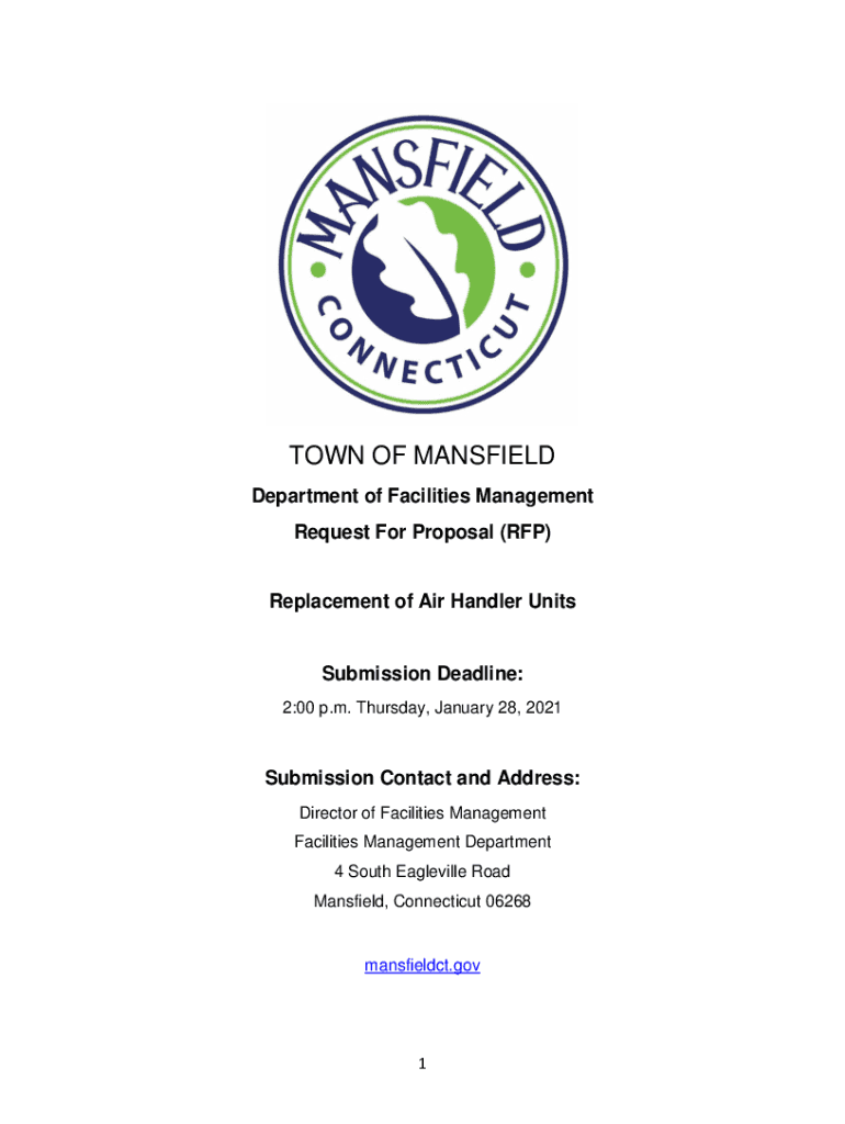 TOWN OF MANSFIELD Department of Facilities Management Request For Proposal (RFP)Replacement of Air Handler UnitsSubmission Deadline: 2:00 p.m. Thursday, January 28, 2021Submission Contact and Address: