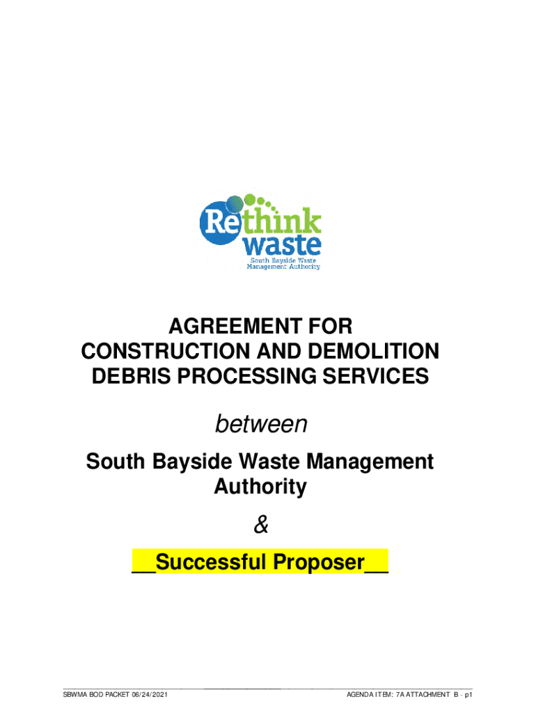 AGREEMENT FOR CONSTRUCTION AND DEMOLITION DEBRIS PROCESSING SERVICES between South Bayside Waste Management Authority __Successful Proposer_____ ___ OBAMA BOD PACKET 06/24/2021 AGENDA ITEM: 7A ATTACHMENT