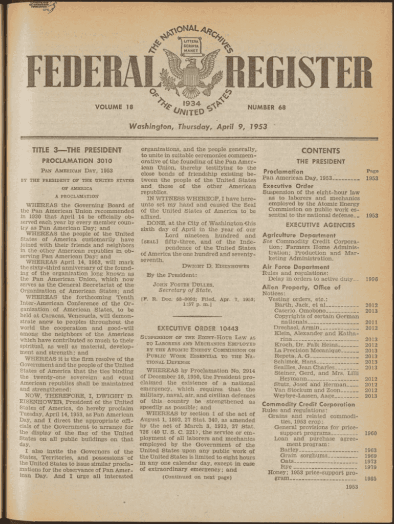 ^ O N LA VOLUME 18r^/**934×Sold NUMBER 68Washington, Thursday, April 9, 1953TITLE 3 THE PRESIDENT PROCLAMATION 3010 P an A American Day, 1953BY THE PRESIDENT OP THE UNITED STATES OF AMERICA A PROCLAMATIONWHEREAS