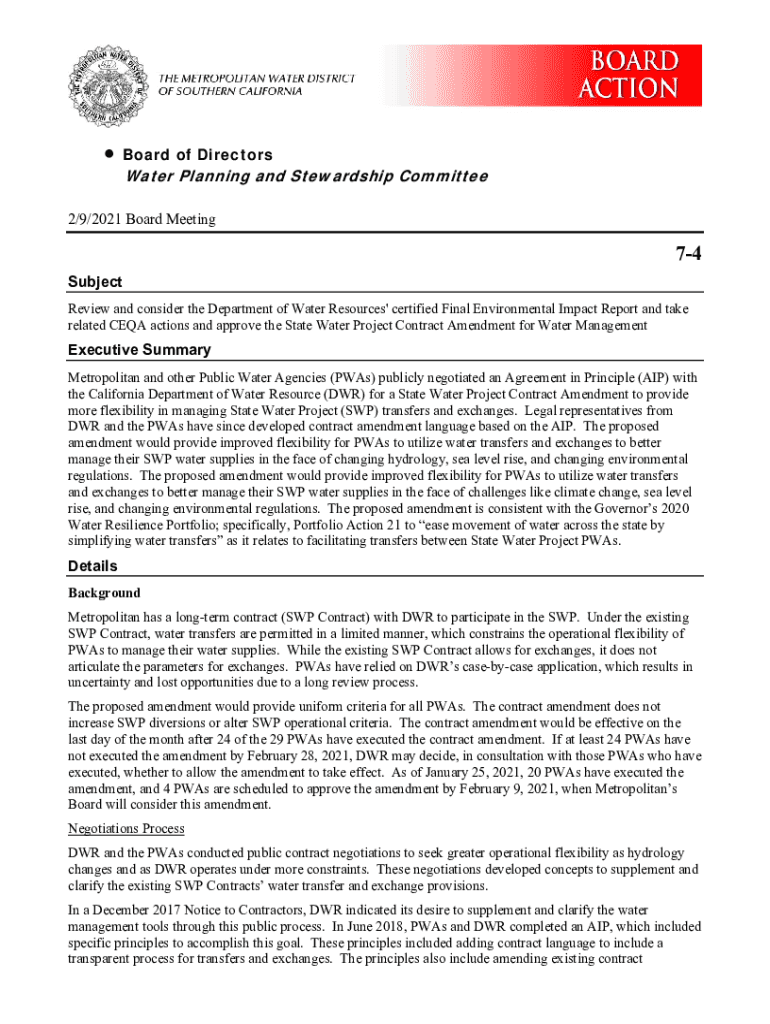 Board of Directorate Planning and Stewardship Committee2/9/2021 Board Meeting74 Subject Review and consider the Department of Water Resources\' certified Final Environmental Impact Report and take
