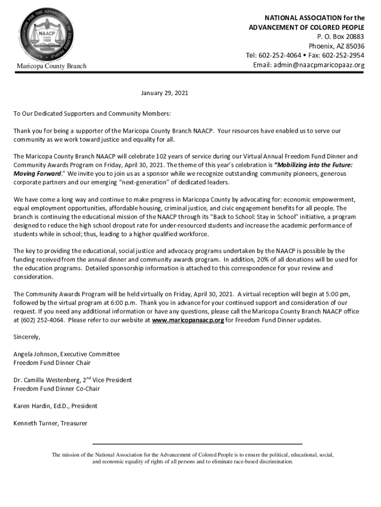 NATIONAL ASSOCIATION for the ADVANCEMENT OF COLORED PEOPLE P. O. Box 20883 Phoenix, AZ 85036 Tel: 6022524064 Fax: 6022522954 Email: admin×naacpmaricopaaz.org Maricopa County Branch January 29, 2021,