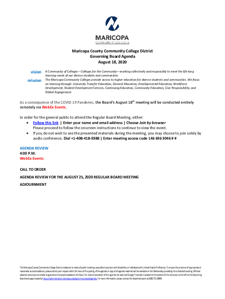Maricopa County Community College District Governing Board Agenda August 18, 2020, vision mission Community of CollegesColleges for the Community working collectively and responsibly to meet the lifelong