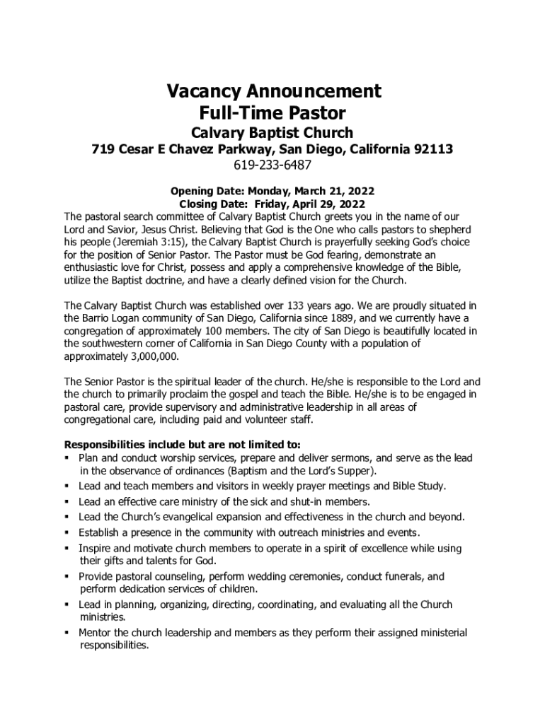 Get the free Vacancy Announcement For Senior Pastor Calvary Baptist Church
