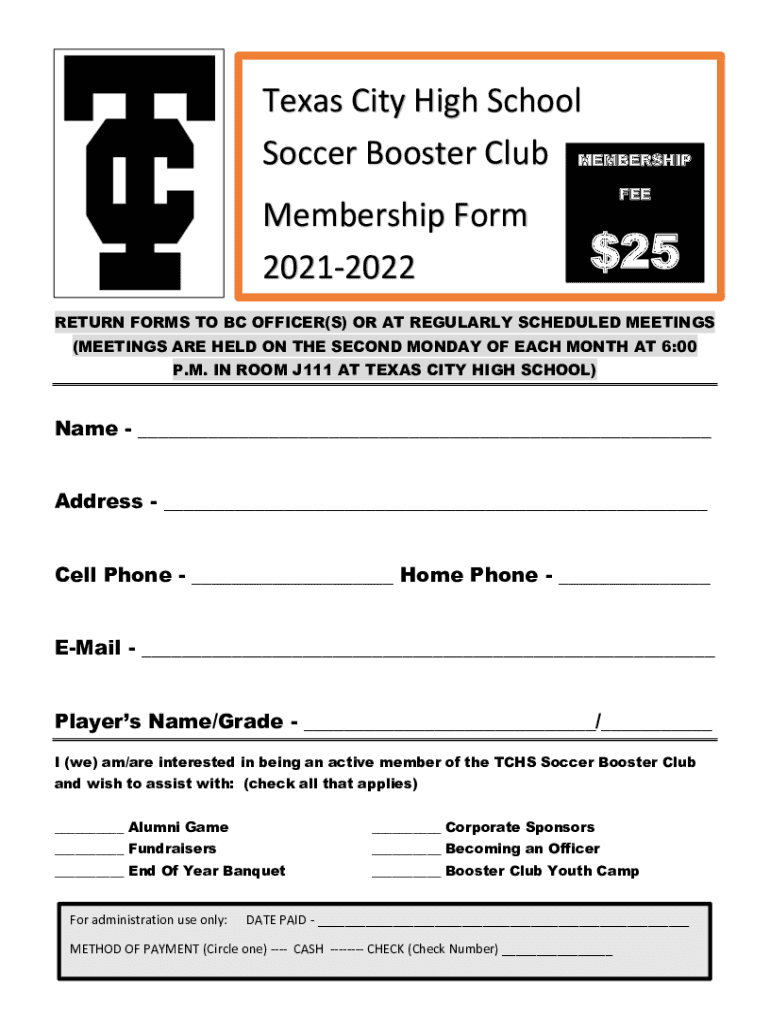 Texas City High School Soccer Booster Club MEMBERSHIP Form 20212022FEEMEMBERSHIP FEE: $20.00 PER PERSON×25RETURN FORMS TO BC OFFICER(S) OR AT REGULARLY SCHEDULED MEETINGS (MEETINGS ARE HELD ON THE