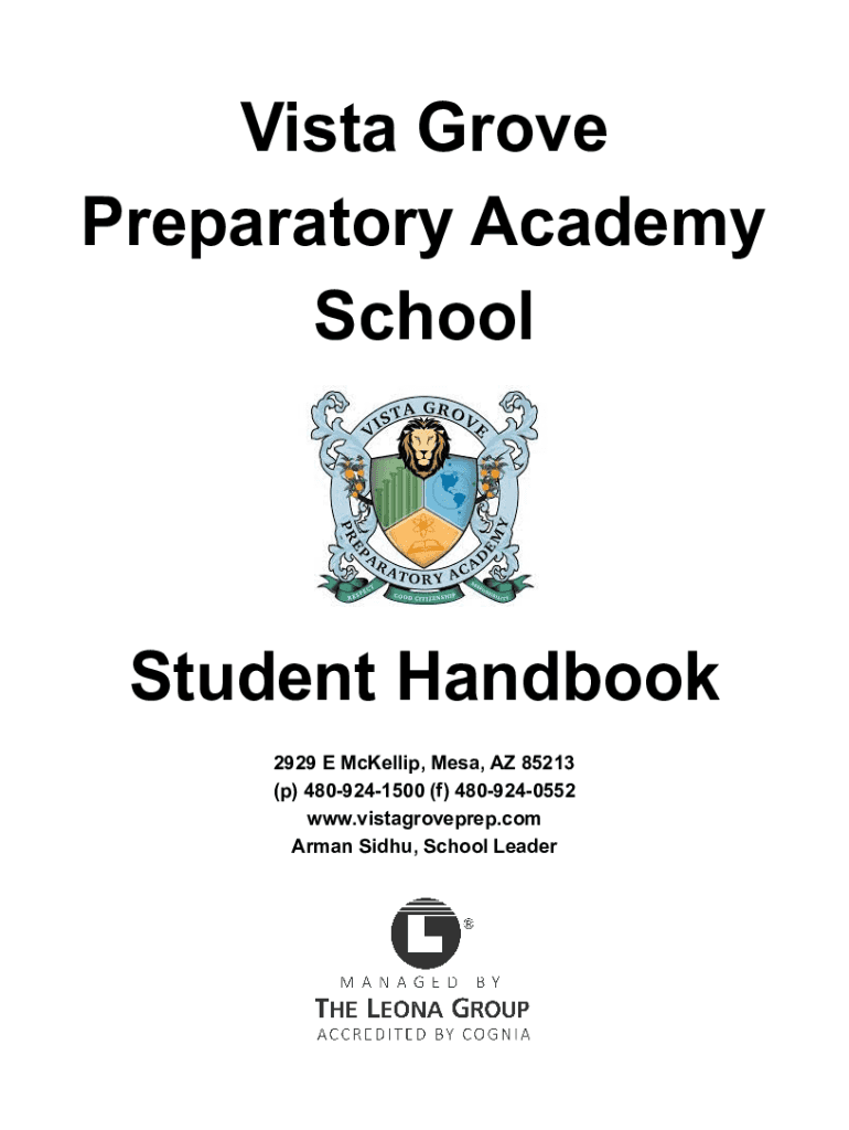 Vista Grove Preparatory Academy SchoolStudent Handbook 2929 E McKellar, Mesa, AZ 85213 (p) 4809241500 (f) 4809240552 www.vistagroveprep.com Aryan Sadhu, School Lamentable of Contentious Commitment
