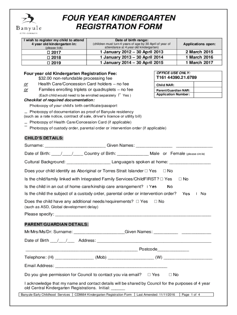 FOUR YEAR KINDERGARTEN REGISTRATION FORM I wish to register my child to attend 4-year-old kindergarten in:Date of birth range: Applications open:(please tick)(children must turn 4 years of age by