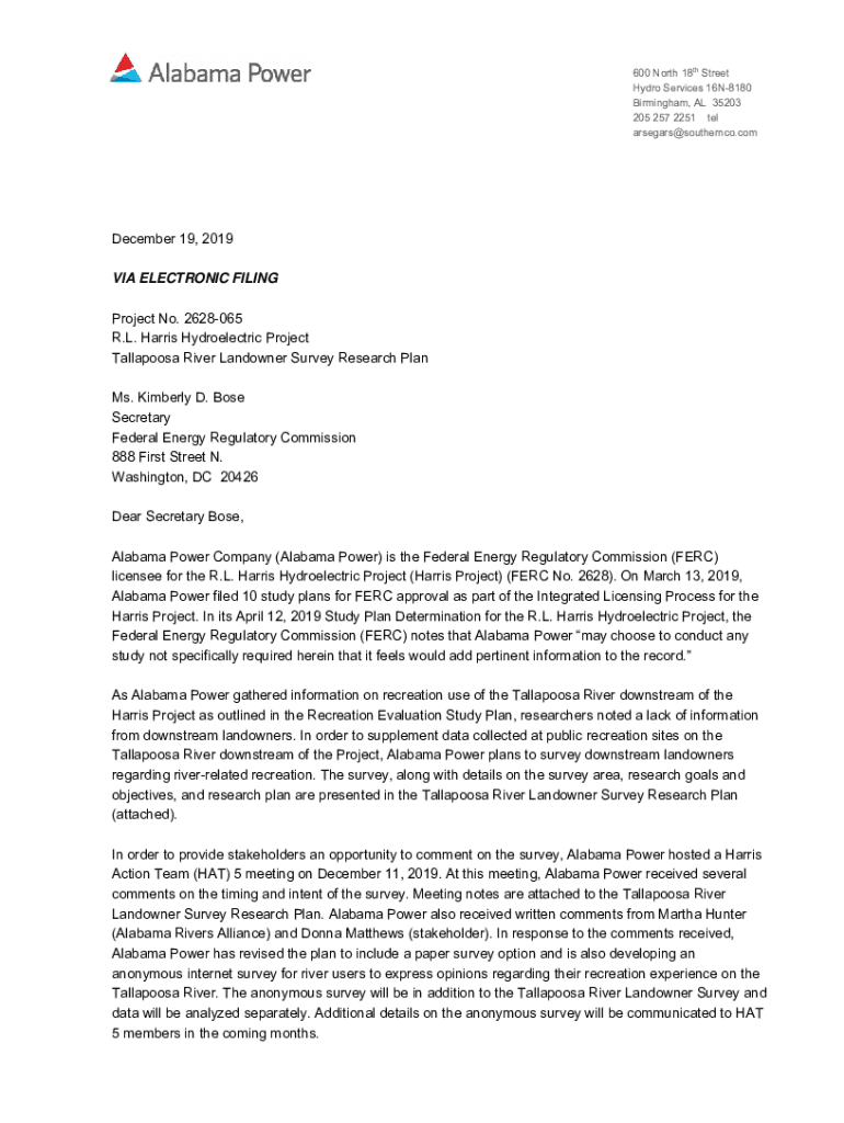 600 North 18th Street Hydro Services 16N8180 Birmingham, AL 35203 205 257 2251 tel arrears×southernco.com December 19, 2019, VIA ELECTRONIC FILING Project No. 2628065 R.L. Harris Hydroelectric Project