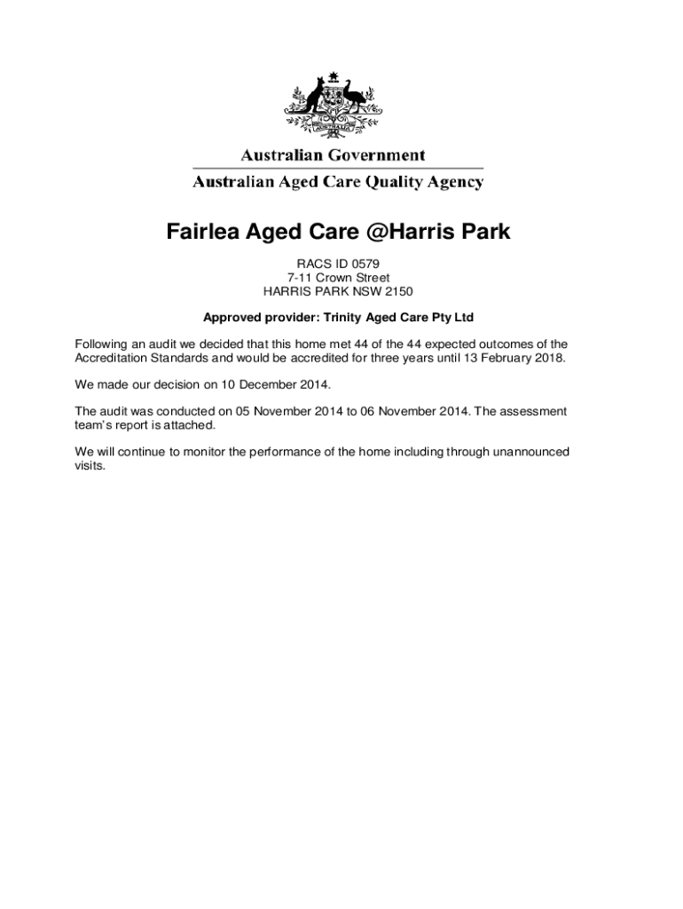 Fair lea Aged Care Harris Park RACE ID 0579 711 Crown Street HARRIS PARK NSW 2150 Approved provider: Trinity Aged Care Pty Ltd Following an audit we decided that this home met 44 of the 44 expected