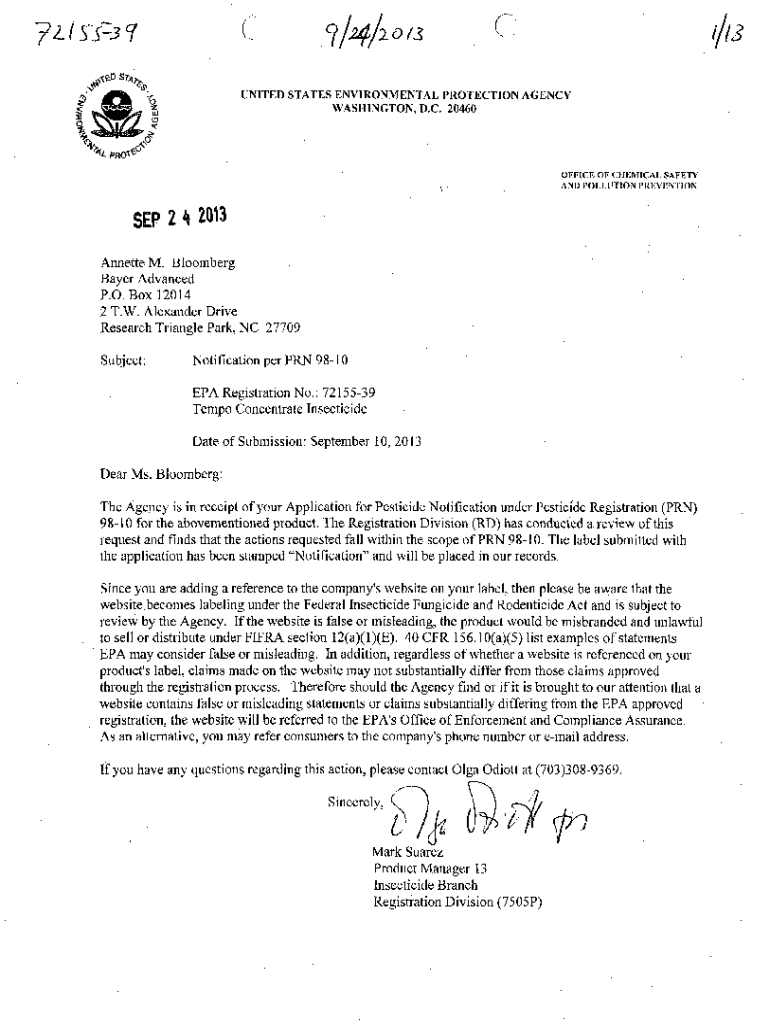 UNITED STATES ENVIRONMENTAL PROTECTION AGENCY WASHINGTON, D.C. 20460OFFICE OF CHEMICAL SAFETY AND POLLUTION PREVENTION SEP 2 × 2013 Annette M. Bloomberg Bayer Advanced P.O. Box 12014 2 T.W. Alexander