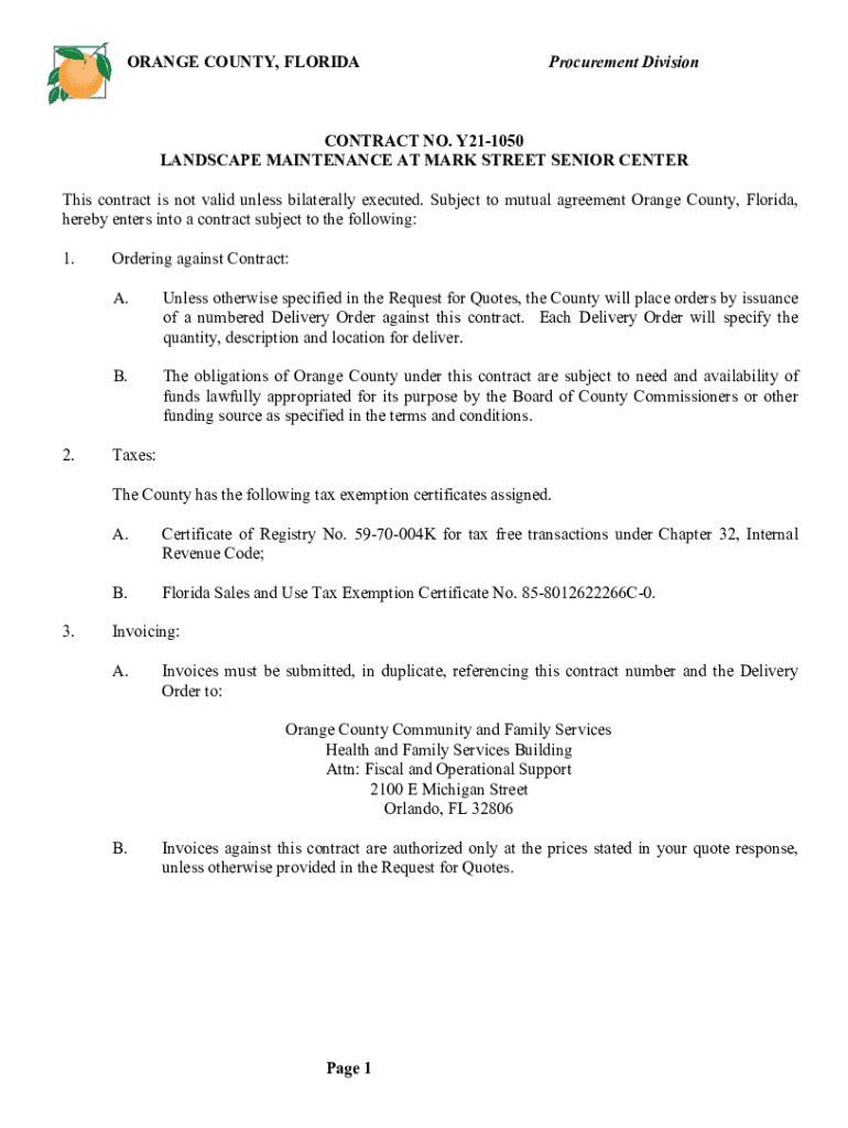 ORANGE COUNTY, FLORIDAProcurement DivisionCONTRACT NO. Y211050 LANDSCAPE MAINTENANCE AT MARK STREET SENIOR CENTER This contract is not valid unless bilaterally executed. Subject to mutual agreement