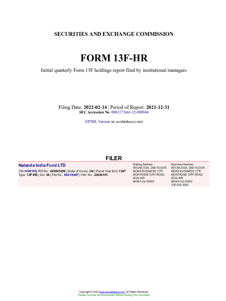 Get the free Nalanda India Fund LTD Form 13F-HR Filed 2022-02-14. Accession Number