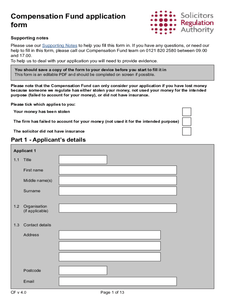 Compensation Fund application form Supporting notes Please use our Supporting Notes to help you fill this form in. If you have any questions, or need our help to fill in this form, please call our