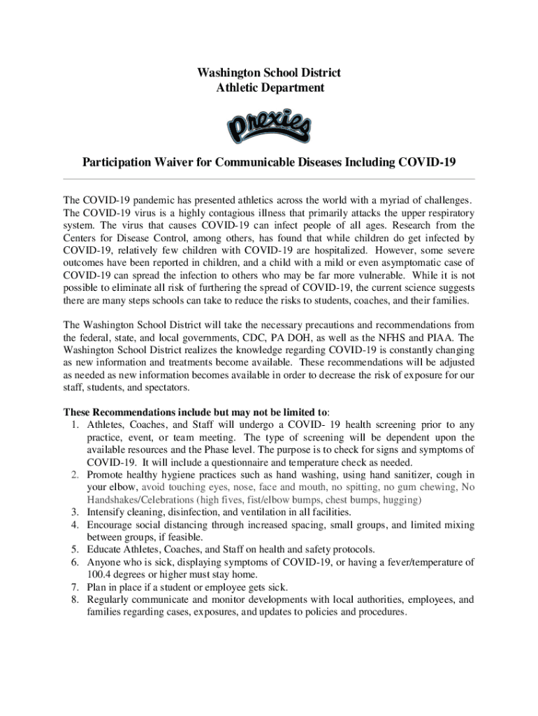 Washington School District Athletic DepartmentParticipation Waiver for Communicable Diseases Including COVID-19 The COVID-19 pandemic has presented athletics across the world with a myriad of challenges.