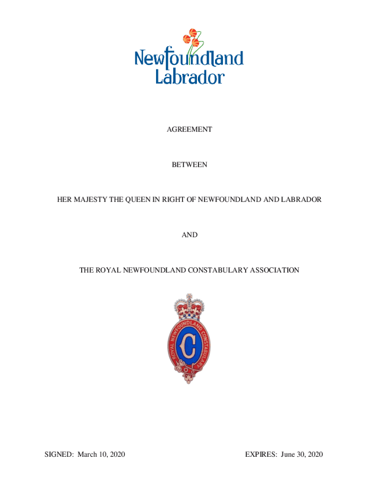 AGREEMENTBETWEENHER MAJESTY THE QUEEN IN RIGHT OF NEWFOUNDLAND AND LABRADORANDTHE ROYAL NEWFOUNDLAND CONSTABULARY ASSOCIATIONSIGNED: March 10, 2020EXPIRES: June 30, 2020THIS AGREEMENT made this 10th