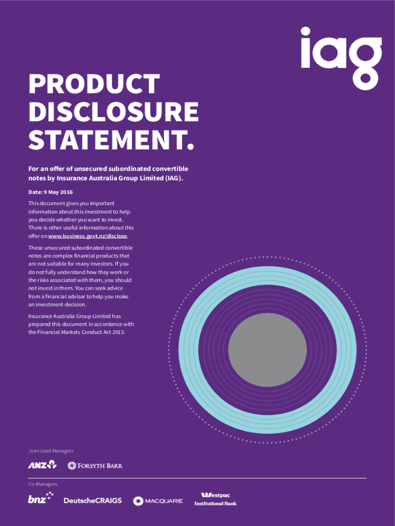 PRODUCT DISCLOSURE STATEMENT. For an offer of unsecured subordinated convertible notes by Insurance Australia Group Limited (IAG). Date: 9 May 2016 This document gives you important information about