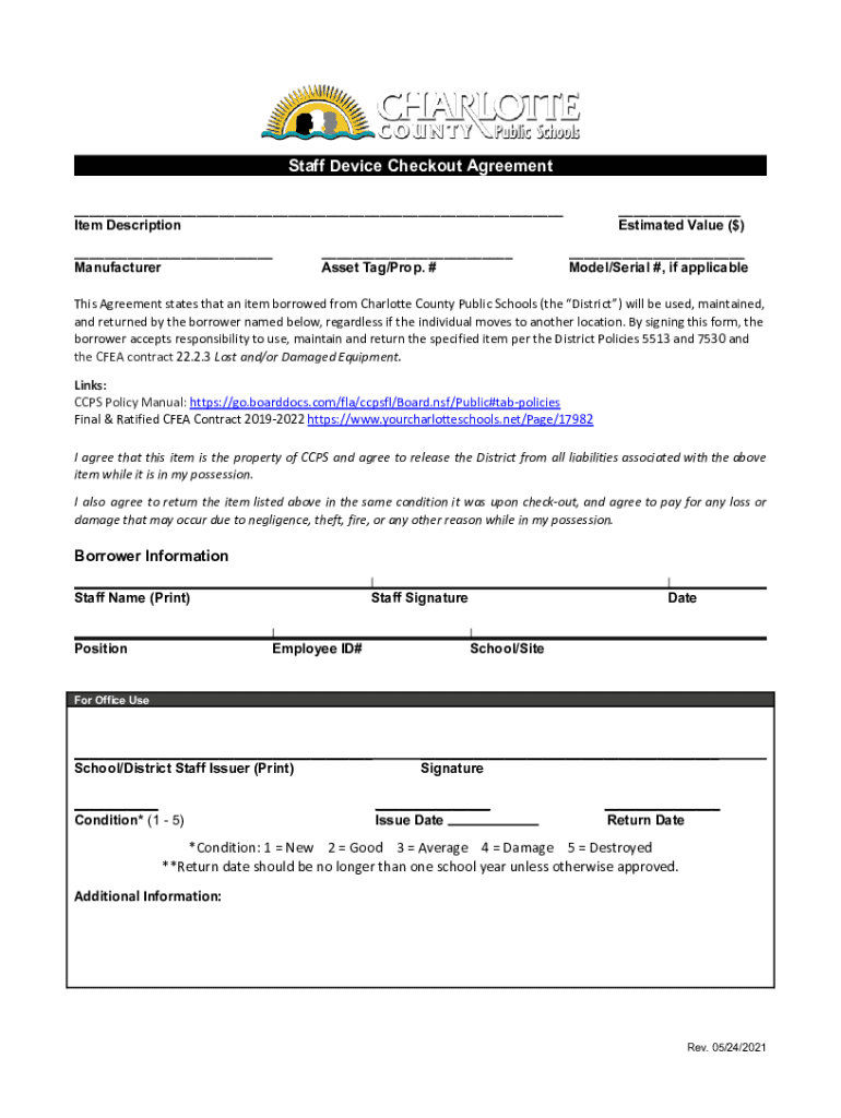 Staff Device Checkout Agreement ___ Item Description ___ Manufacturer___ Asset Tag/Prop. #___ Estimated Value ($) ___ Model/Serial #, if applicableThis Agreement states that an item borrowed from