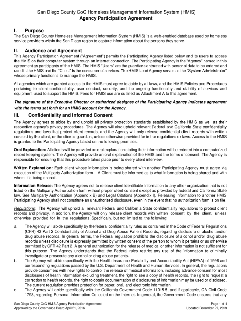 San Diego County COC Homeless Management Information System (HIS) Agency Participation Agreement I. Purpose San Diego County Homeless Management Information System (HIS) is a web enabled database