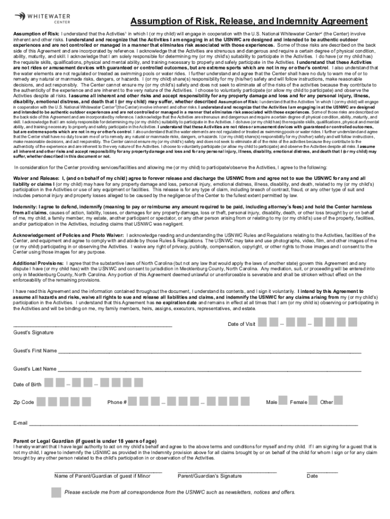 Assumption of Risk, Release, and Indemnity Agreement Activities1Assumption of Risk: I understand that the in which I (or my child) will engage in cooperation with the U.S. National Whitewater Center2