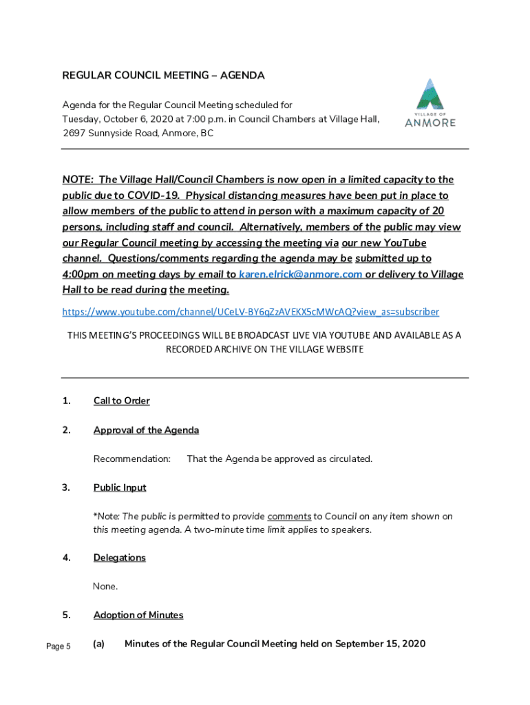 REGULAR COUNCIL MEETING AGENDA for the Regular Council Meeting scheduled for Tuesday, October 6, 2020, at 7:00 p.m. in Council Chambers at Village Hall, 2697 Sunnyside Road, Anymore, NOTE: The Village