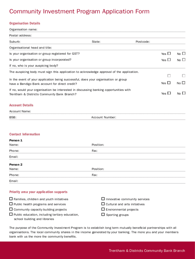 The wwwbendigobankcomausiteassetsbranchassetscommunity investment program application typically requires information about the organization or group, details of the community project or initiative being proposed, and a breakdown of how the funding or support will be used.